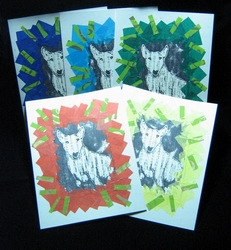 I printed the Terrier with black ink onto different papers–my favorite turned out to be some Japanese novel pages I had pulled from old books I had bought from the NY Public Library–I think that text in the background adds some character to each face; (my husband said it looked like “The Matrix”). Then I surrounded each print with layers of small pieces of tissue paper. To make the sets, I added a little of the tissue design to each envelope flap to coordinate with the card colors. They turned out so festive and I haven’t decided which one I will frame and display.
