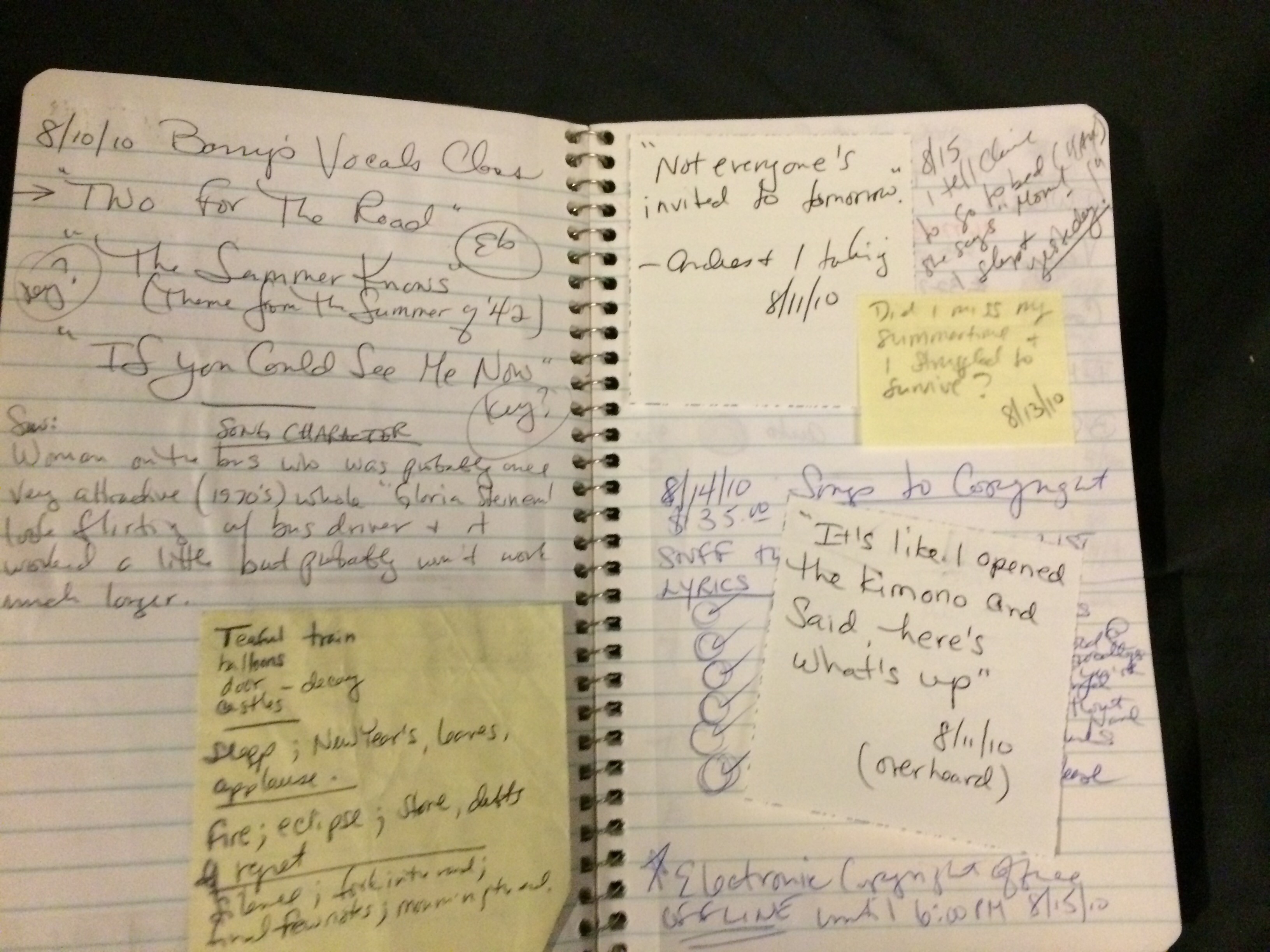 In addition to all the everyday “boring” things I write down, these daily notebooks are where I collect my thoughts and make observations about what I am thinking and feeling at any given time. Part of my introspection process involves creating collages, and each of the notebooks has a unique collaged cover. These covers are created as I begin using a new book so the cover reflects things I am thinking about at the time. On the back covers I write the month and year the book was created, and when it is full, the month and year completed. For easy reference I store the notebooks in chronological order on my bookshelf at home. I go back to them frequently to see what I was doing at a specific point in time, to remember when I met a particular person, to locate a quote or story to use for a song lyric, or just for random inspiration!