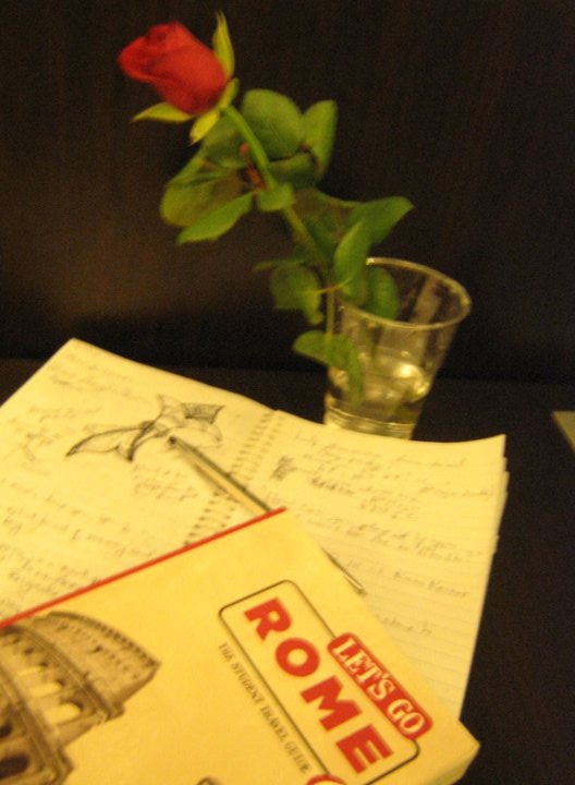 Ah, yes, this photo is my first red rose of Rome, I refused it at least 3 times, yet, still, my friend bought it for me anyway. The vendor stood close to us, hovering over our dinner table at a local family-run restaurant. I had never experienced that before, salesmen coming inside a restaurant with bundles of flowers for sale. Of course, I thanked my friend, but at first I secretly wished he had not given it to me; I started to stress a little.  We had only just met, why did he want to buy me a flower? How would I keep it from wilting while we ate? Where would I keep it in my little B&B room? So many stupid worries that never came about. It did not wilt as I had feared and I ultimately found a good place to display it in my room, in a drinking glass on top of a little black counter-top. It stood there, perky, all week, next to a TV I watched for about 15 minutes one day. (I caught an old episode of Colombo dubbed in Italian. It was strangely entertaining, but not enough to keep me in my room when San Lorenzo was waiting outside!)