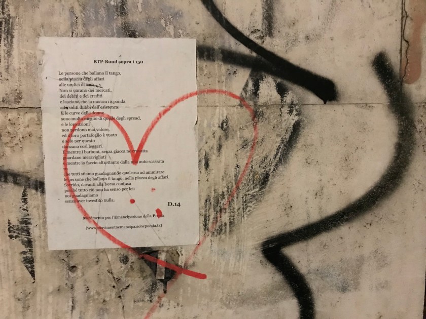 The best things in life, like inspiration, are free. I walk down a new street and chance to see a poem pasted to a wall. The words inspire me; the random discovery inspires me; the sense of the sublime presented in a crude, common way inspires me. Someone else before me has apparently been inspired to add a red heart on top of the words, their spontaneous red curving lines spilling out onto the wall itself. I take a photo and post it here on my blog because this public display of words and thoughts and art inspires me to post my writings in public too. The domino-effect could continue on and on, depending on who sees it, who values it, who sees something personal in it, who is moved to take creative action.