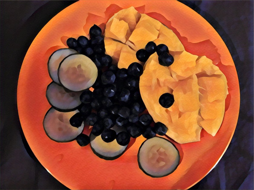 A few years ago friend in Italy sent me a fun duo of melamine plates that I usually use on special occasions. But yesterday I decided to use the orange colored plate as I prepared a cucumber, mango, and blueberries for breakfast. I was struck by how pretty it all looked arranged it on the cheerful plate. I took a photo of it and created a “painting” using a filter. I have used it as my main photo (above).