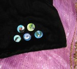 After I have designed a set, I apply acrylic medium to the back of each gem. I use a cotton swab because I have found too many paintbrush hairs imbedded in previous pieces and they are a pain to remove after the acrylic has dried.