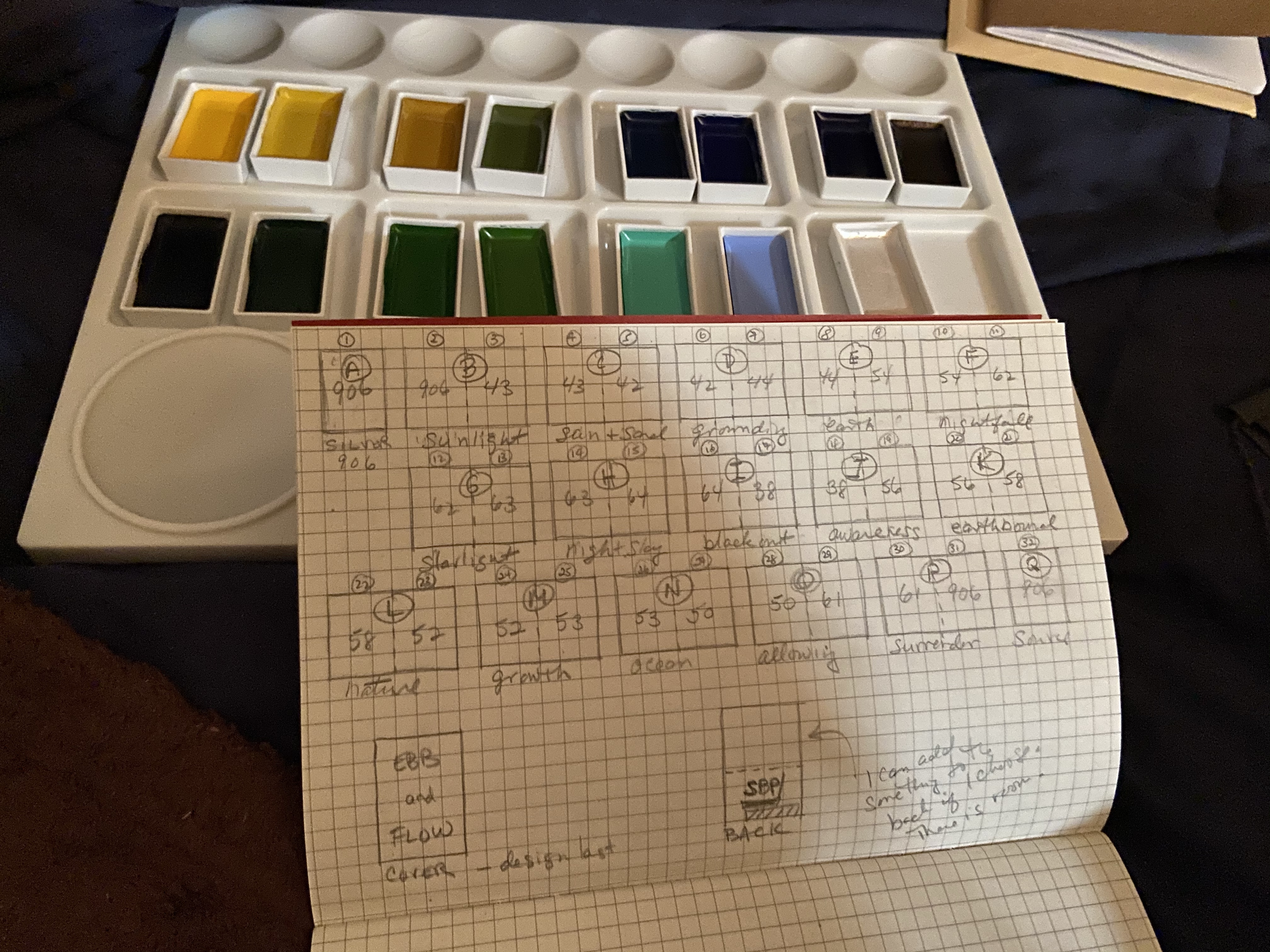 MY PROCESS: Here is a little glimpse into my planning notes – another notebook I used to flesh out my watercolor layouts and collage ideas. The first image is a filtered example of “clustering” that I did on the idea of “FLOW”. You can see that word is in the center. [I learned this technique many, many, many, years ago from a book called “Writing the Natural Way” by Gabriele Rico; it is an excellent tool for writing, creating, and introspection. Click on the word “clustering” to read about the steps involved.]